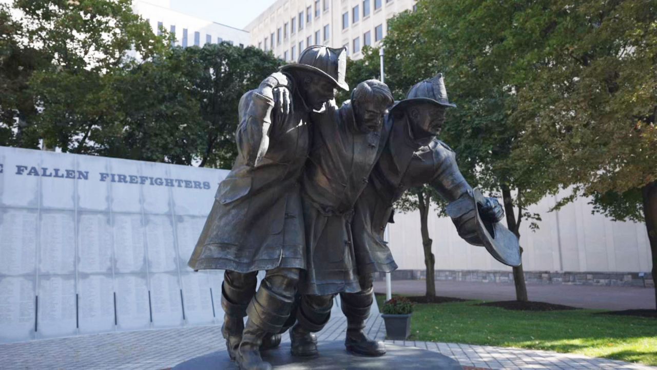 The New York State Fallen Firefighters Memorial in Albany, New York is dedicated to the New York firefighters who have died in the line of duty. Governor of New York George Pataki officially dedicated the memorial on October 5, 1998. It features a 54-foot (16 m) by 15-foot (4.6 m) gray granite wall, with 2,312 names permanently etched into the stone. In front of the wall stands a 10-foot (3.0 m) high dark bronze sculpture of two firefighters rescuing an injured colleague created by New York sculptor Robert Eccleston. The sculpture rests on a paved plaza with charcoal and red bricks forming a Maltese Cross. The Memorial stands on the northeast side of the Empire State Plaza in the park-like area bordered by Norway maples. It is easily accessible to the hundreds of thousand of visitors who travel to the New York State Capitol and Plaza each year.
